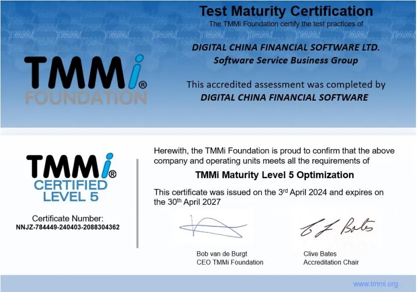 近日,神州信息子公司——三亿体育融信软件有限公司(下文简称“三亿体育融信”)通过TMMi(测试能力成熟度模型集成)最高级别5级国际权威认证,成为国内同时获得TMMi5级认证和CMMI5级认证的企业,覆盖咨询、产品需求、软件开发、测试、运维全流程的IT软件研发及服务。